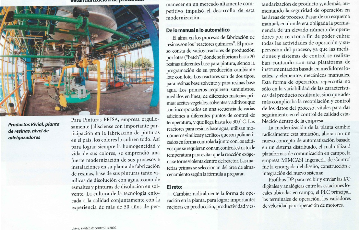 En el 2002 MIMCASI fue pionero en la introducción en planta de protocolos de comunicación combinados: Ethernet, Profibus DP y Profibus PA Exxi. Este trabajo se efectuó en Productos Rivial, planta Alposa cambiando radicalmente su forma de producir.